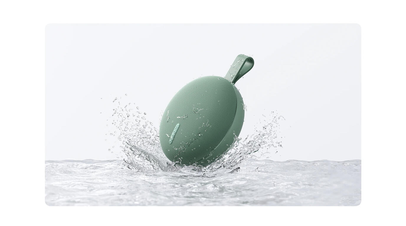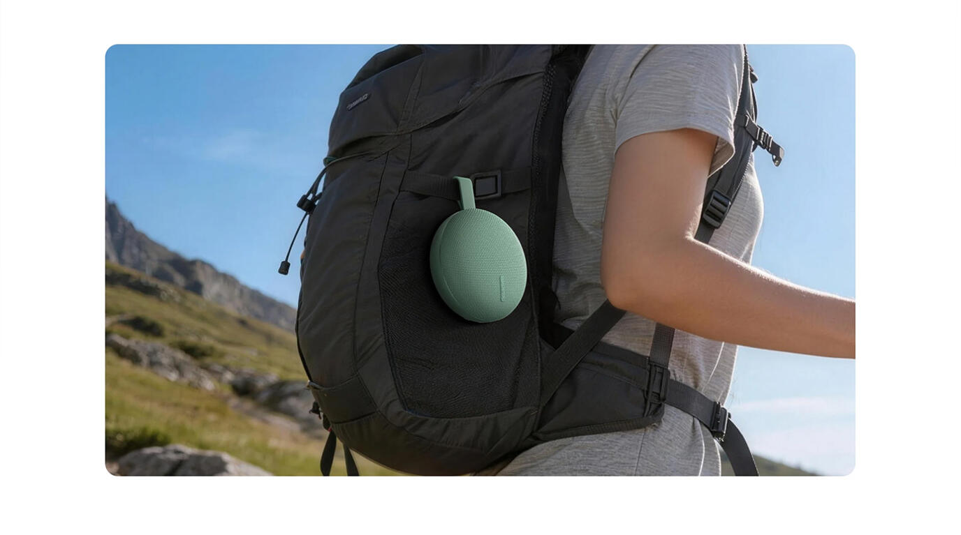 اسپیکر از بدنه گرد و جمعوجور با روکش پارچهای مرغوب بهره میبرد که grip مناسبی فراهم میکند. نوار accent براق در اطراف بدنه، جلوه بصری جذابی ایجاد کرده و وزن تقریبی ۲۰۰ گرم (مشابه وزن یک سیب) آن را برای حمل تکدستی ایدهآل میسازد. ابعاد دستگاه ۹.۸×۴.۶×۱۳ سانتیمتر است و در دو رنگ مشکی و سبز عرضه میشود. پایه ضدلغزش لاستیکی و پورتهای جانبی پوشیدهشده، مقاومت در برابر شرایط محیطی را افزایش میدهند.