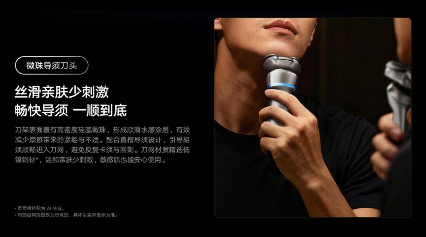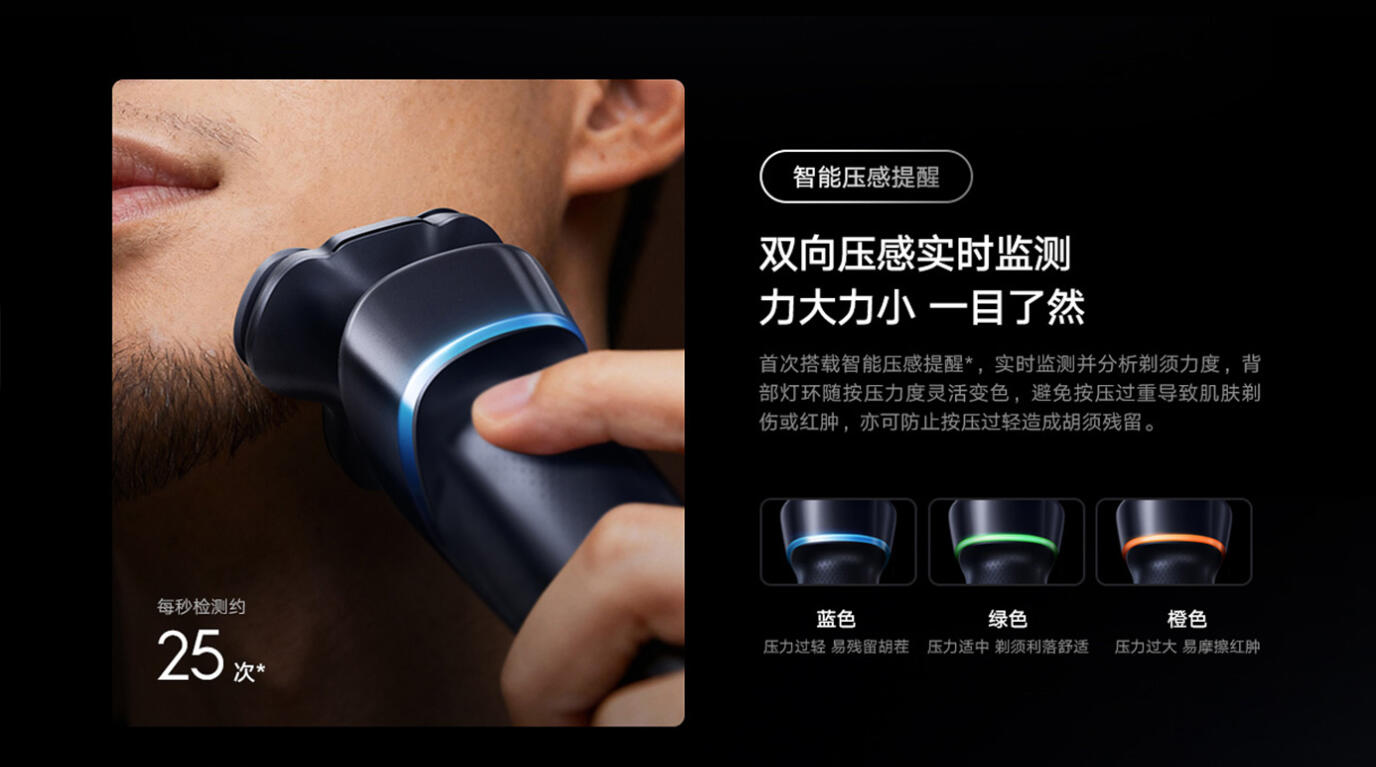 سر اصلاح با طراحی شناور همهجهته ۳۶۰ درجه، به خطوط و شکستهای مختلف صورت از جمله خط فک و چانه سازگار میشود و حرکات عمودی، جانبی، زاویهدار و چرخشی را پشتیبانی میکند تا نواحی از دست رفته را کاهش دهد. سنسور فشار هوشمند، نیروی اعمالشده را نظارت کرده و حلقه نور عقبی را در واقعیزمان تغییر رنگ میدهد تا از فشار بیش از حد بر پوست جلوگیری کند.