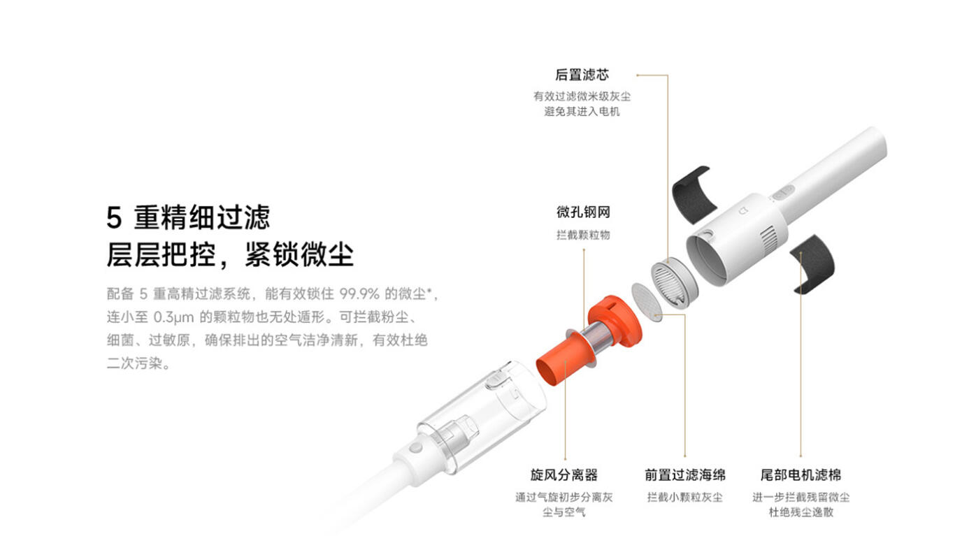 سیستم فیلتراسیون Mijia Lightweight Vacuum Cleaner شامل پنج لایه پیشرفته است: محفظه سیکلون پرسرعت، فیلتر مش فولادی ریز، فیلتر اسفنجی جلویی، عنصر HEPA و پد محافظ موتور. شیائومی ادعا میکند این سیستم ۹۹٫۹% ذرات ریز به اندازه ۰٫۳ میکرون را به دام میاندازد و آلودگی ثانویه را به حداقل میرساند. ظرف گرد و غبار شفاف ۲۰۰ میلیلیتری و اجزای فیلتر قابل شستشو هستند و پس از شستشو، باید ۲۴ ساعت در هوا خشک شوند تا آماده استفاده مجدد گردند.