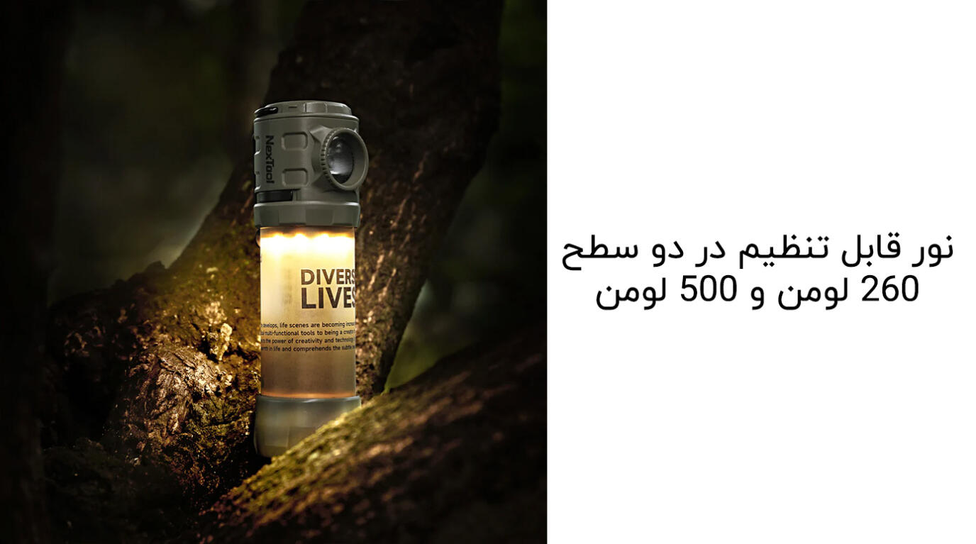 با وجود ابعاد کوچک، NexTool LP10 از یک لامپ LED کممصرف و با دوام استفاده میکند که میتواند تا 500 لومن نور یکنواخت و وسیع تولید کند. این میزان نور، برای روشنکردن اطراف چادر، مسیر پیادهروی در کوه یا حتی استفاده داخل خانه، کاملاً کافی و قابلاعتماد است. نکته قابل توجه اینکه این چراغ از قابلیت تنظیم شدت نور نیز پشتیبانی میکند، بهطوری که میتوانید بسته به نیاز و شرایط محیط، میزان روشنایی را کم یا زیاد کنید. این ویژگی هم در صرفهجویی مصرف باتری تأثیر دارد و هم چشم شما را در نور شب اذیت نمیکند.