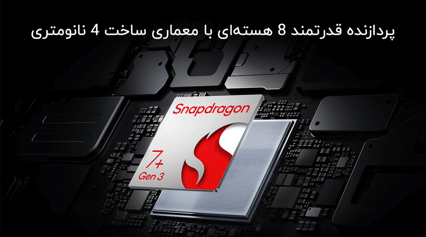 تراشه ۴ نانومتری Snapdragon 7+ Gen 3 شامل یک هسته Cortex-X4 با فرکانس ۲٫۸ گیگاهرتز، چهار هسته Cortex-A720 با ۲٫۶ گیگاهرتز و سه هسته Cortex-A520 با ۱٫۹ گیگاهرتز همراه با GPU Adreno 732 است. این ترکیب امتیاز حدود ۱٬۷۳۳٬۶۹۱ را در بنچمارک AnTuTu ثبت کرده و عملکردی عالی برای مالتیتسکینگ سنگین، ویرایش ویدئو، بازیهای پیشرفته و کارهای روزمره ارائه میدهد.
