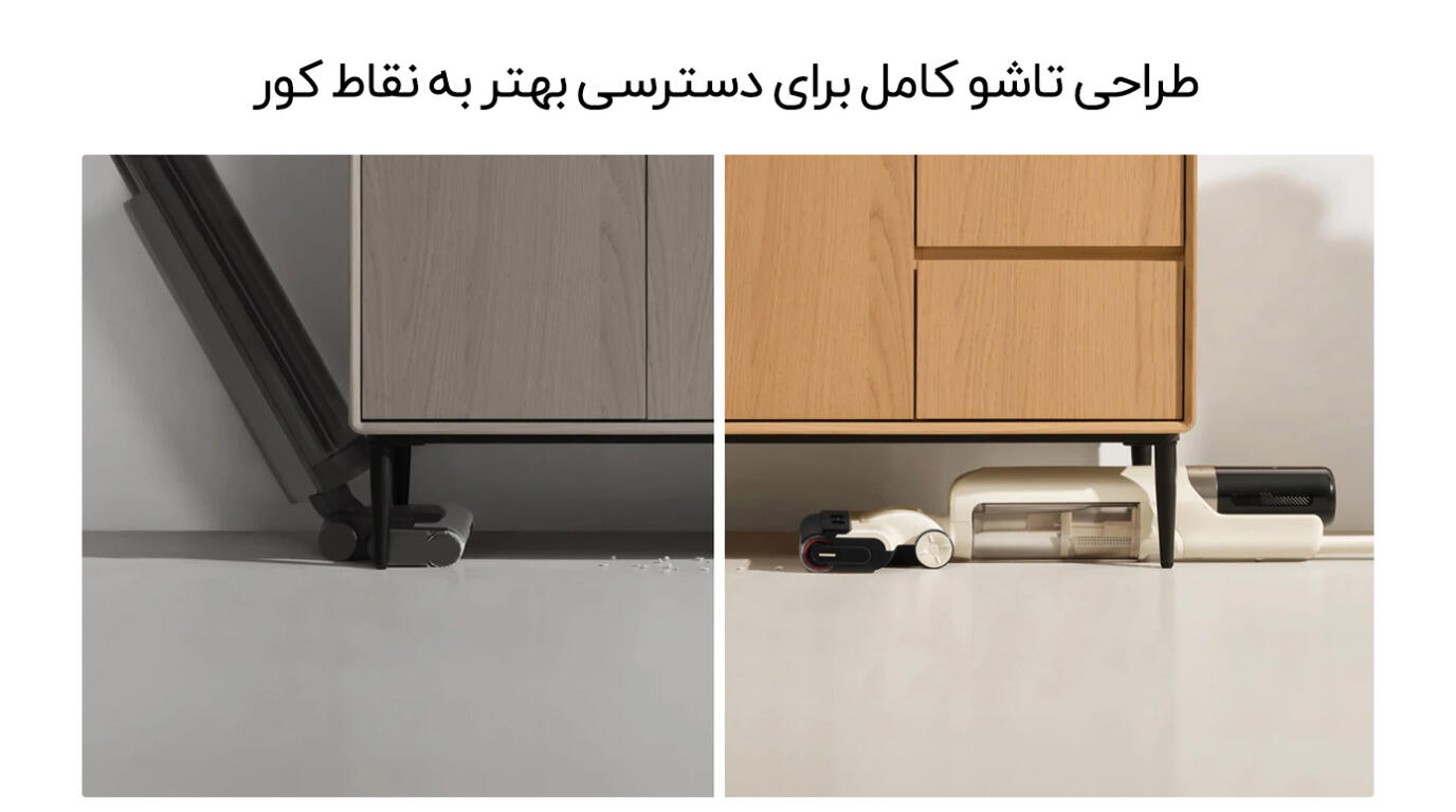 دستگاه با طراحی ارگونومیک و وزن سبک ۳.۹۸ کیلوگرم (۸.۸ پوند)، همراه با قابلیت ۱۸۰ درجه خوابیده برای دسترسی زیر مبلمان کمارتفاع (تا ۱۴ سانتیمتر)، مانورپذیری بالایی ارائه میدهد. چرخش ۹۰ درجه برای حرکت آسان اطراف موانع، برس غلتکی خودران برای کاهش تلاش کاربر و طراحی مخزن آب پایین برای تعادل بهتر مرکز ثقل، کاربری را تسهیل مینماید. برس اصلی با دندانههای ضدگرهخوردگی موهای بلند را بدون درهمتنیدگی جمعآوری میکند. چراغ LED برای تشخیص دقیق گردوغبار و موهای حیوانی پنهان، همراه با صفحه نمایش LED و اعلانهای صوتی (مانند هشدار باتری کم یا مخزن آب کثیف پر)، نظارت را آسان میسازد.