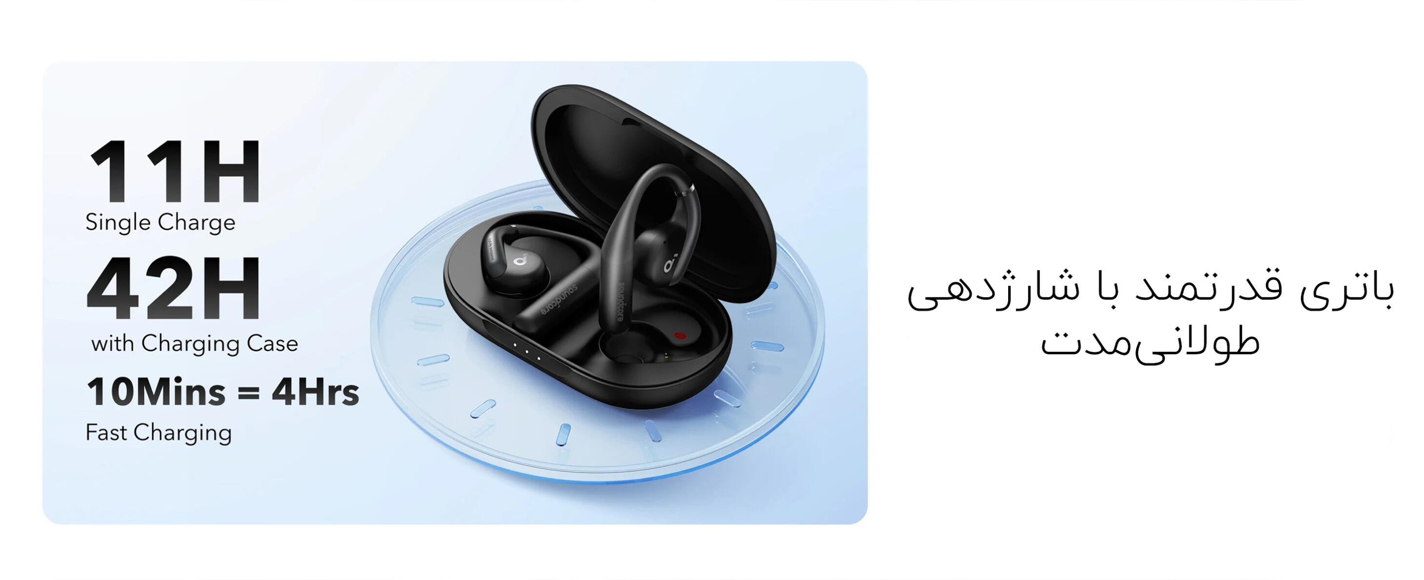 یکی از نقاط قوت اصلی Soundcore AeroFit A3872، باتری قدرتمند آن است. این هدفون با هر بار شارژ تا 11 ساعت استفاده مداوم و با کمک کیس شارژ تا 42 ساعت شارژدهی کلی را فراهم میکند. این ویژگی باعث میشود برای استفاده روزانه و سفرهای طولانی، نیازی به شارژ مداوم نداشته باشید. با قابلیت Fast Charging، تنها چند دقیقه شارژ کافی است تا ساعتها از هدفون استفاده کنید. این ویژگی برای کاربرانی که همیشه در حال حرکت هستند و زمان کافی برای شارژ طولانی ندارند، یک مزیت کاربردی و مهم به شمار میرود.