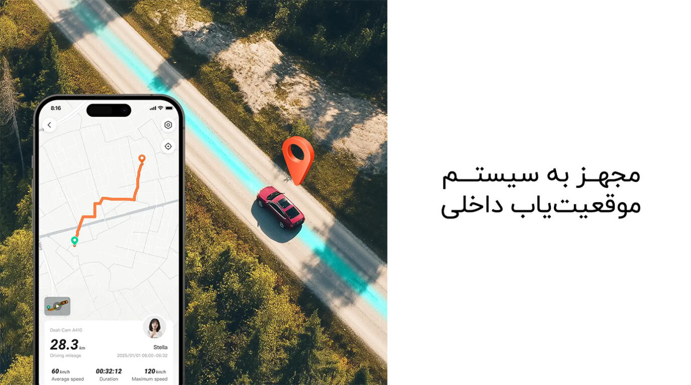 دوربین A800 SE دارای GPS داخلی است که از چهار سامانه موقعیتیابی جهانی شامل GPS، Galileo، GLONASS و QZSS پشتیبانی میکند. این ویژگی، مسیر حرکت، سرعت و موقعیت مکانی را با دقت بالا ثبت میکند و برای بررسی حوادث یا ثبت مسیر سفر کاربرد فراوانی دارد. تمام اطلاعات از طریق اپلیکیشن 70mai در دسترس است.
