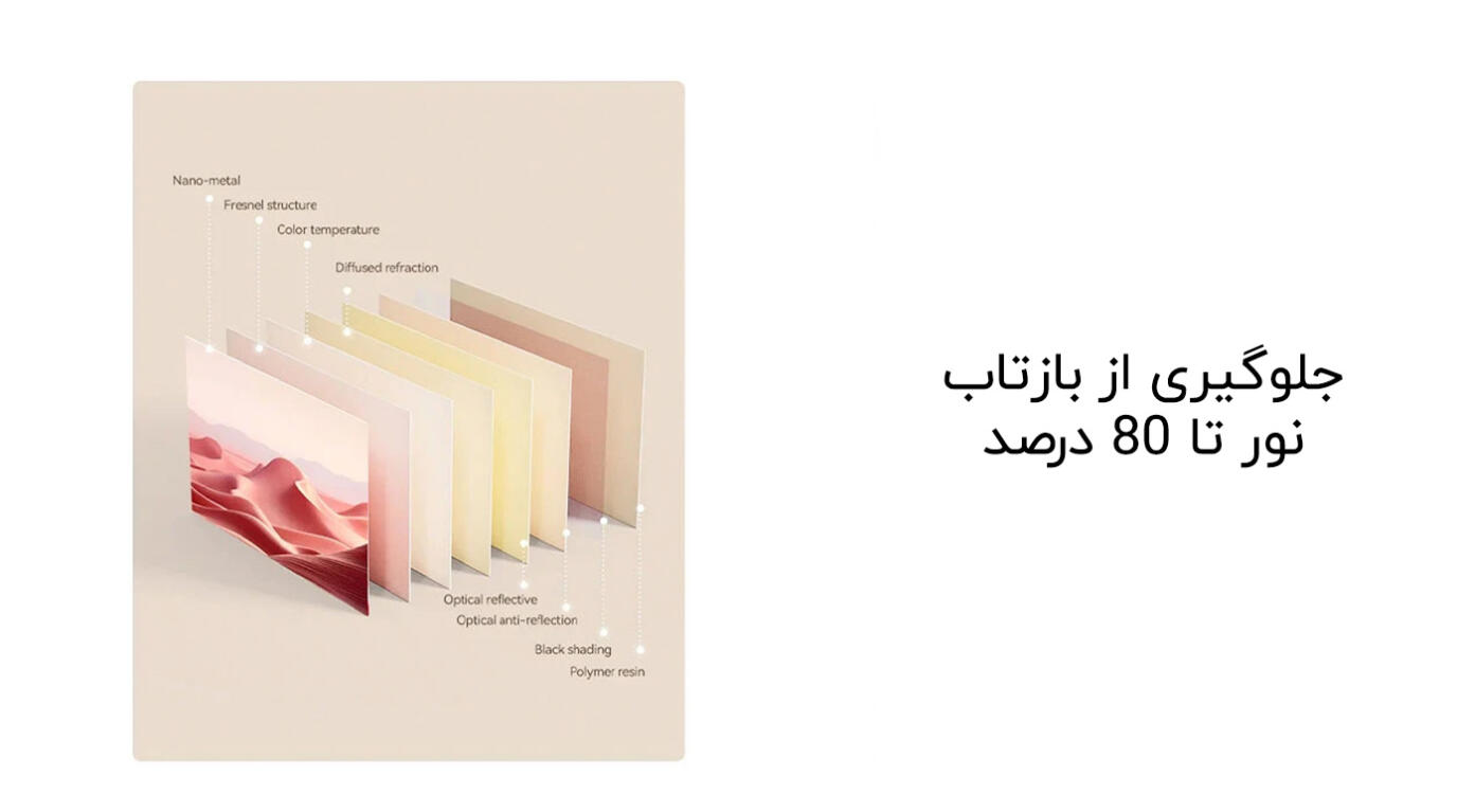 جلوگیری از بازتاب نور تا 80 درصد | بهرهگیری از تکنولوژی پیشرفته فرزنل (Fresnel) برای کاهش بازتاب نور از زوایای غیر مستقیم | 2 برابر وضوح و کنتراست بیشتر نسبت به پردههای پروژکتور معمولی | وزن سبک 1.45 کیلوگرم | نازک و باریک | نصب آسان | حاشیههای باریک 1 سانتیمتری