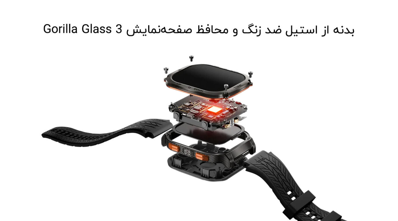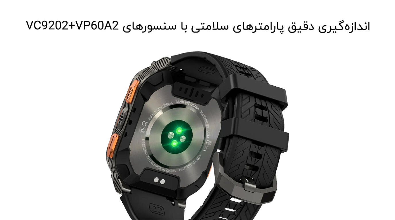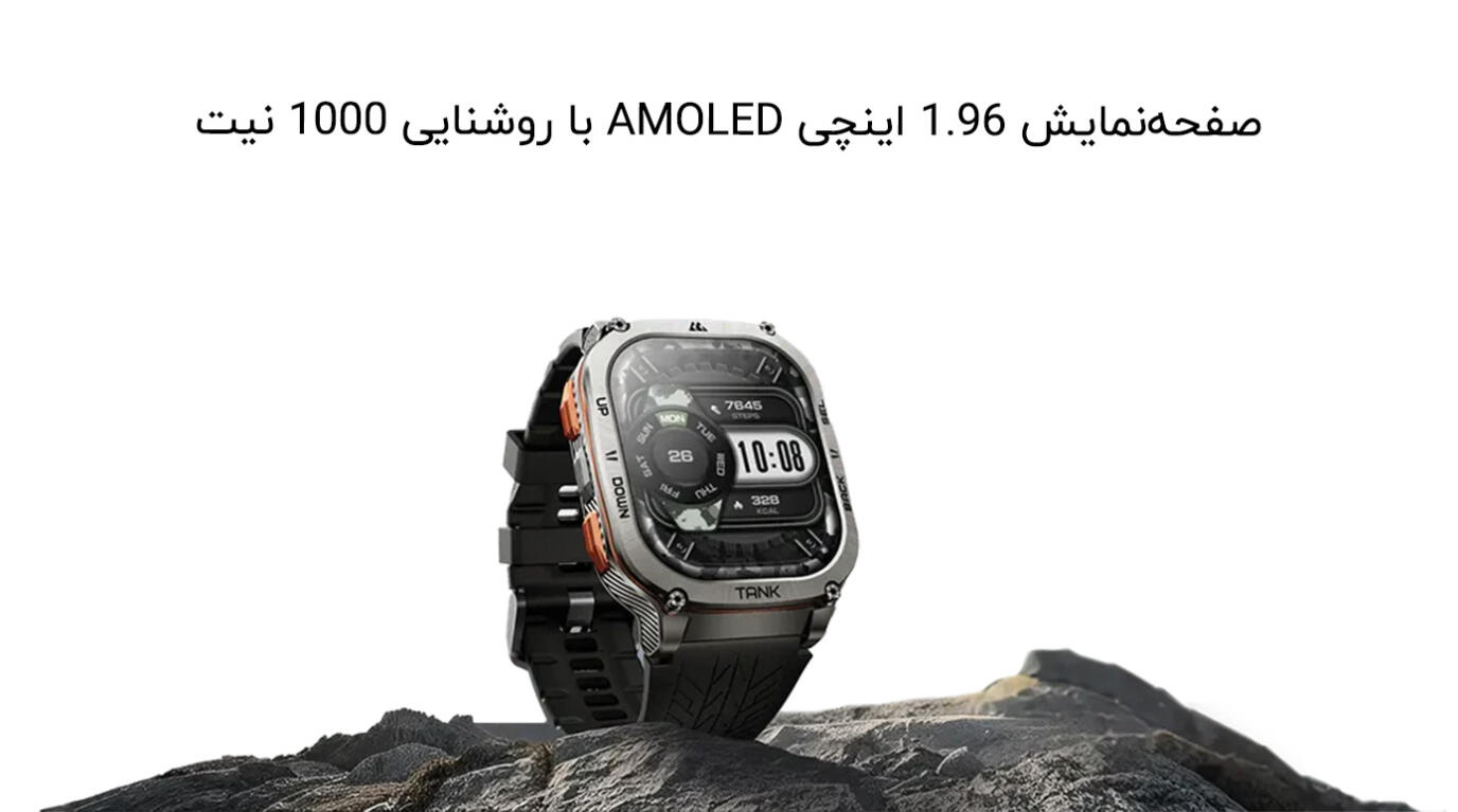 صفحهنمایش 1.96 اینچی AMOLED با روشنایی 1000 نیت | رزولوشن صفحهنمایش 502×410 پیکسل | نرخ نوسازی تصویر 60 هرتز | لایه محافظ صفحه Gorilla Glass 3 | فریم از استیل ضد زنگ | وزن 75.4 گرم | مجهز به میکروفون و بلندگو داخلی برای مکالمه بر بستر بلوتوث | بند 22 میلیمتری قابل تعویض | باتری 480 میلی آمپر ساعتی | شارژ کامل در 2 ساعت | شارژدهی 15 روز با استفاده روزمره | سنسورهای سنجش پارامترهای سلامتی VC9202+VP60A2 | مجهز به مکانیاب داخلی L1+L5 | استاندارد نظامی تستهای 15گانه آمریکا MIL-STD-810H | مقاوم در برابر آب با گواهیهای 5ATM و IP69K | اتصال بیسیم بلوتوث نسخه 5.3 | امکان اتصال به گوشیهای اندروید و iOS | اپلیکیشن اختصاصی برای نظارت و ذخیره فعالیتها | قطبنما، ارتفاعسنج و فشارسنج