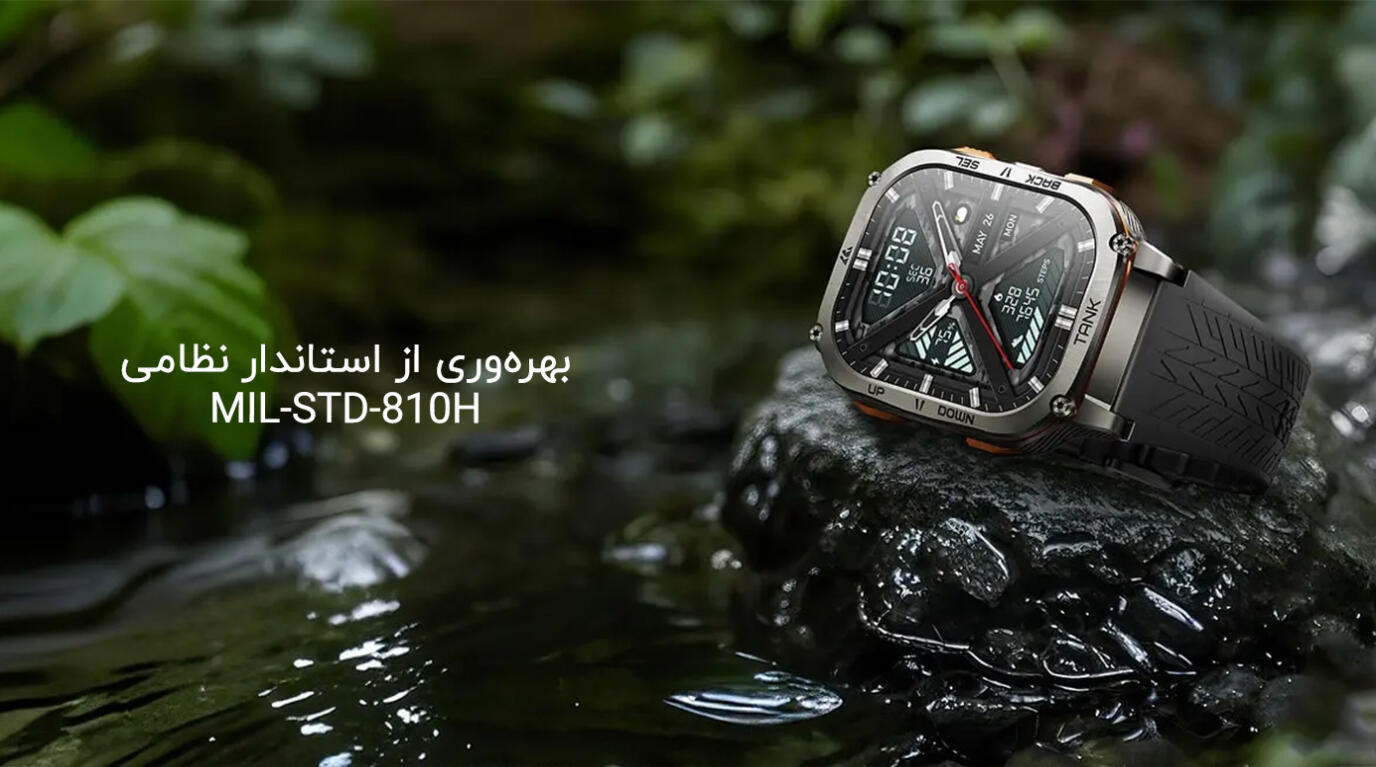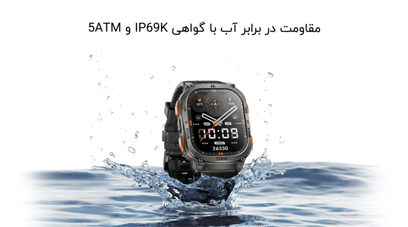 گواهینامه ارتش ایالات متحده، گواهی مقاومت در برابر آب 5ATM و IP69K استحکام این ساعت هوشمند را ضمانت میکنند. درواقع اگر به دنبال یک ساعت هوشمند خوشقیمت و سختجان هستید که در برابر خطر عوامل بیرونی حسابی مقاوم باشد، این ساعت بهترین گزینه است. خصوصاً برای افرادی که اهل ورزشهای آبی و شنا هستند، این ساعت هوشمند کاملا ضد آب است.