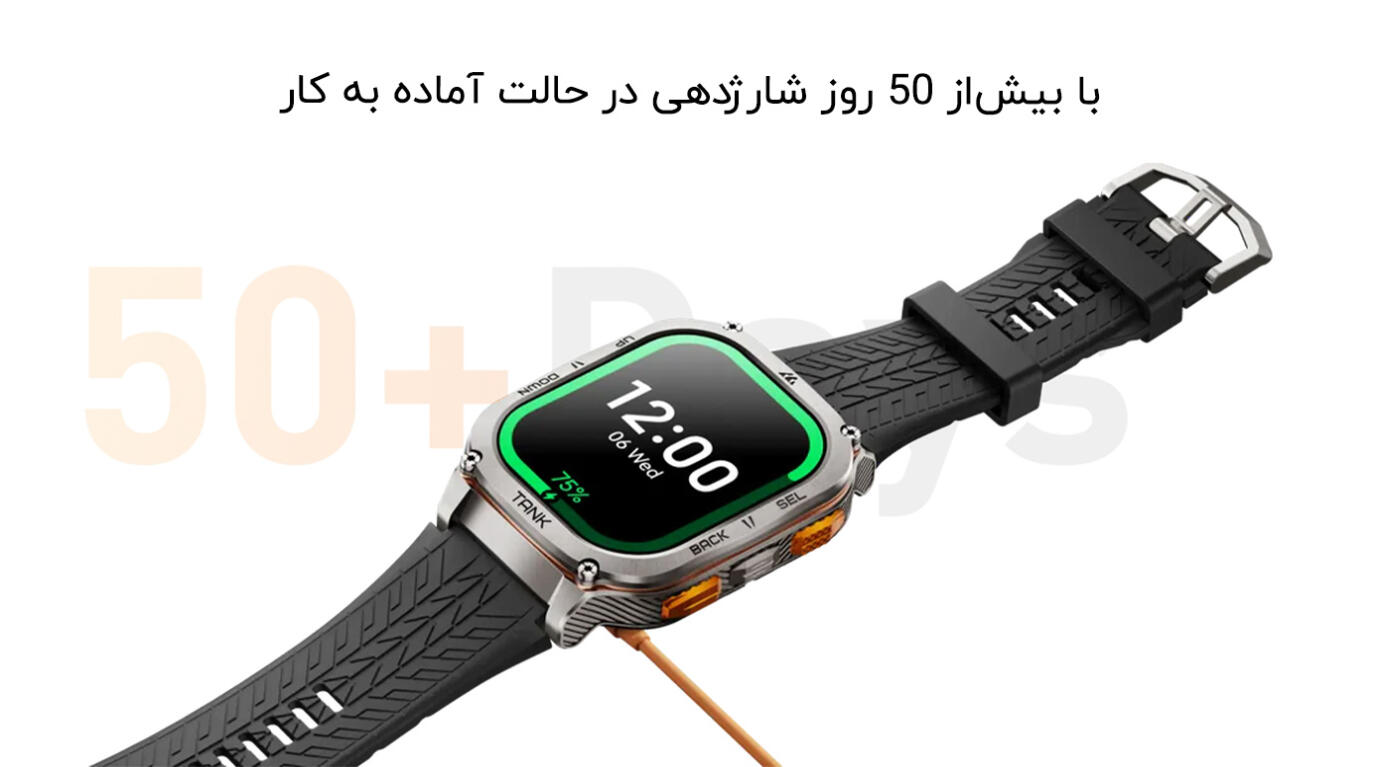 ساعت هوشمند کاسپت مدل Tank M3 Ultra با بهرهگیری از باتری کبالت خالص و پردازنده کممصرف دو حالته، بهینهسازی مصرف انرژی را به بالاترین سطح رسانده است. این ساعت هوشمند با یک بار شارژ کامل، تا 12 تا 15 روز دوام میآورد و حتی با استفاده مداوم از ویژگیهای مختلف، همچنان عملکرد قابل قبولی دارد. شارژر مگنتی همراه نیز به شما امکان میدهد تا باتری ساعت را در کمترین زمان ممکن شارژ کنید. ساعت هوشمند کاسپت تانک M3 اولترا با باتری قدرتمند 470 میلیآمپر ساعتی خود، با یک بار شارژ کامل، تا 12 تا 15 روز دوام میآورد و حتی با فعال بودن نمایشگر همیشه روشن نیز تا 3 تا 5 روز قابل خواهد بود.