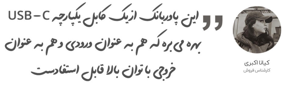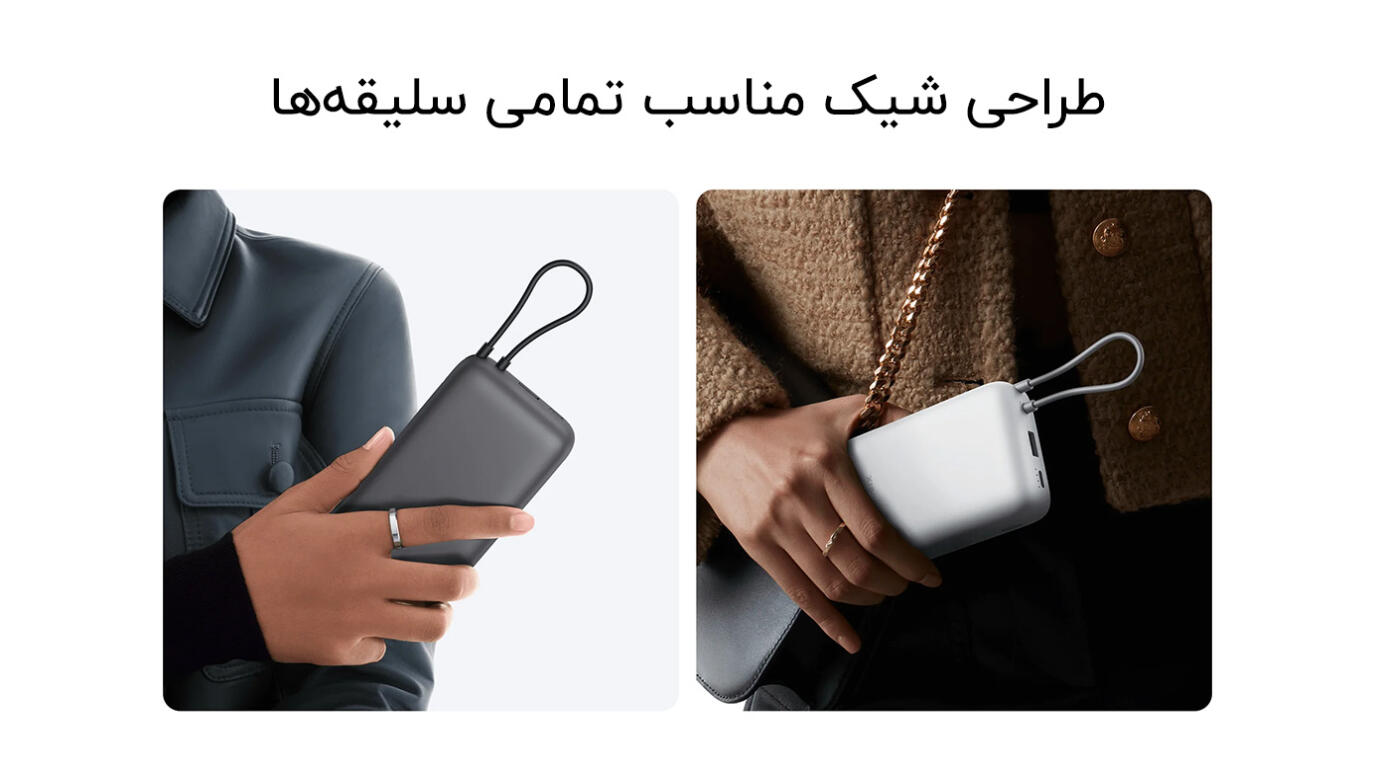 این پاوربانک با طراحی مینیمال و رنگهای مات خاکستری ظریف (در دو تناژ)، ظاهری شیک و حرفهای دارد که به راحتی در کیف یا جیب جای میگیرد. کابل USB-C یکپارچه با فضای ذخیرهسازی اختصاصی، حمل و نگهداری را بسیار آسان میکند و نیاز به حمل کابل جداگانه را حذف مینماید. این ویژگی، portability را به سطح جدیدی ارتقا داده و محصول را برای استفاده روزانه و سفر ایدئال میسازد.