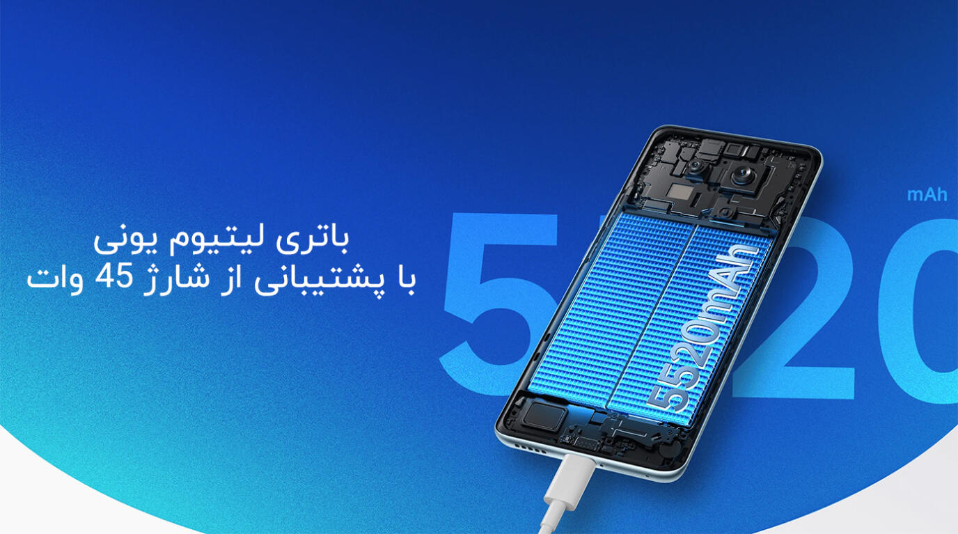 باتری 5520 میلیآمپرساعتی Redmi Note 15 5G بهراحتی بیش از یک روز استفاده معمول را پوشش میدهد. پشتیبانی از شارژ سریع 45 واتی باعث کاهش زمان شارژ میشود و قابلیت شارژ معکوس 18 واتی نیز در شرایط اضطراری کاربردی خواهد بود.