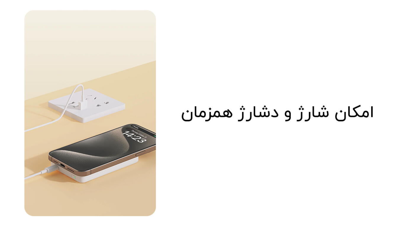 پشتیبانی از شارژ بیسیم ۷.۵ وات (با تشخیص خودکار) و شارژ سیمی حداکثر ۱۸ وات خروجی (از طریق USB-C) و ورودی ۲۰ وات، شارژ کامل پاوربانک را در حدود ۲.۲ ساعت (با آداپتور PD ۲۰ وات) ممکن میسازد. قابلیت شارژ همزمان سیمی و بیسیم (تا مجموع ۱۰ وات) اجازه میدهد چندین دستگاه را به طور همزمان شارژ کنید. حالت pass-through charging نیز پشتیبانی میشود تا هنگام شارژ پاوربانک، خروجی بیسیم فعال بماند.