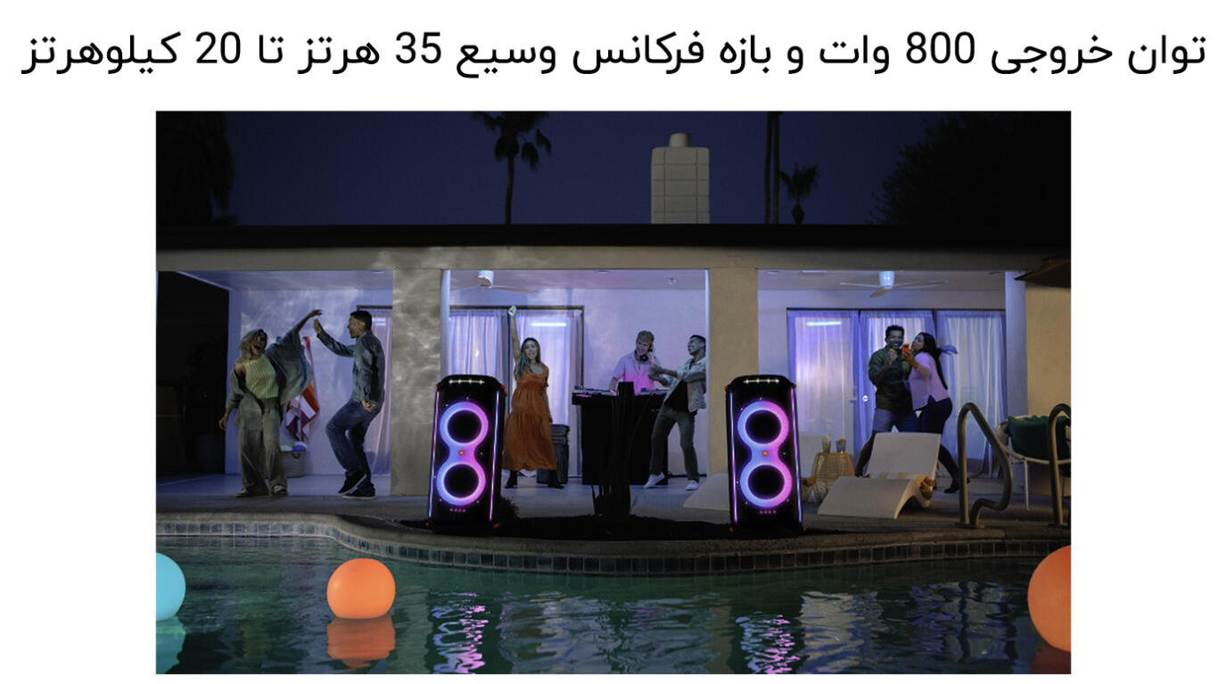 - صدای قدرتمند JBL Original Pro Sound با توان 800W RMS: ارائه صدایی فوقالعاده با ترکیبی از دو توییتر 6.98 سانتیمتری و دو ووفر 20.32 سانتیمتری که صدایی دقیق و قدرتمند را فراهم میکند.