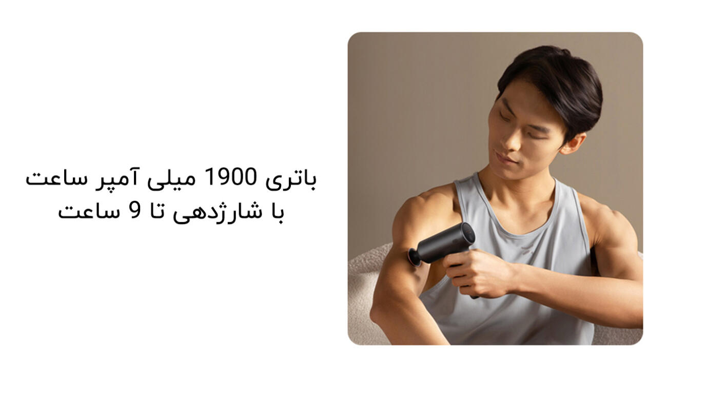 ماساژور تفنگی حرارتی شیائومی مدل Mijia Fascia Gun H3 Mini (MJJMQ08YM) از باتری لیتیوم یون 1900 میلی آمپر ساعت بهره می برد که شارژدهی طولانی مدت ارائه می دهد. بسته به شدت استفاده، دستگاه می تواند تا 9 ساعت کار کند. پورت Type-C و زمان شارژ کامل حدود 2 تا 3 ساعت، شارژ دستگاه را آسان و استاندارد کرده است.