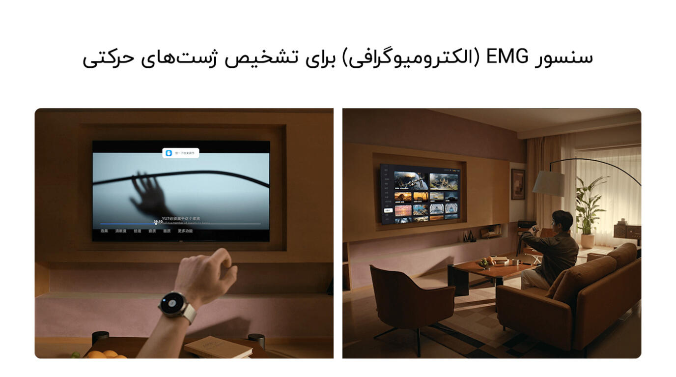 یکی از ویژگیهای برجسته Watch 5، سنسور EMG (الکترومیوگرافی) در کنار ECG (الکتروکاردیوگرام) است. سنسور EMG فعالیت عضلانی دست را اندازهگیری کرده و حرکات انگشت و دست مانند مالش دو انگشت (pinch gesture) یا مشت کردن را تشخیص میدهد. این ژستها برای پاسخ به تماس، خاموش کردن آلارم یا گرفتن عکس با گوشی متصل استفاده میشوند و تعامل بدون تماس را ممکن میسازند.