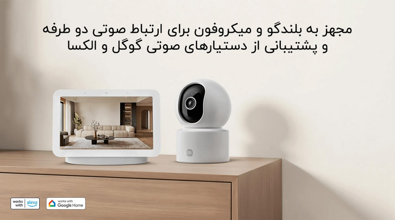 میکروفون و اسپیکر با قطر بزرگ برای مکالمه دوطرفه واضح و بلند، امکان ارتباط از راه دور را میدهد. پشتیبانی از کنترل صوتی با Amazon Alexa و Google Assistant (مانند "Alexa, show the camera") نیاز به دستگاه سازگار دارد. کنترل کامل از طریق اپلیکیشن Xiaomi Home (اندروید ۸+ و iOS ۱۴+) امکان تنظیم مناطق، زمانبندی و دریافت اعلانها را فراهم میکند.
