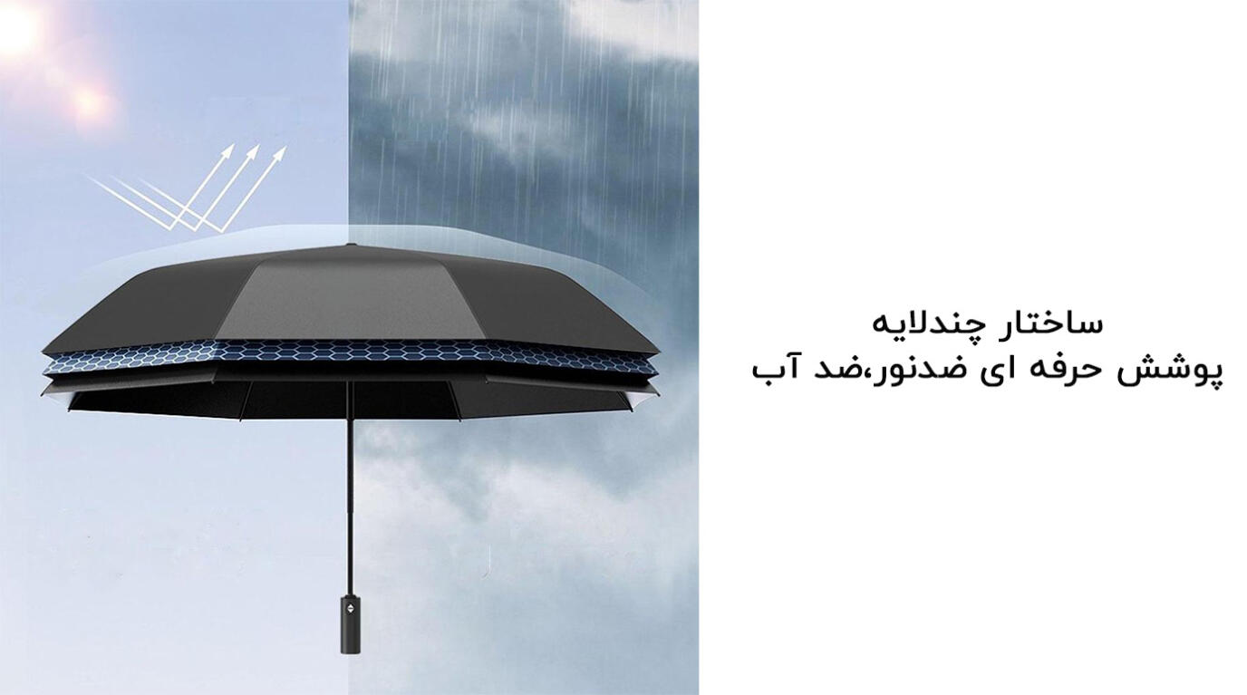 ساختار چتر اتوماتیک شیائومی Risetime مدل ThreeFold چند لایه شامل یک لایه ضد آب فناوری، یک لایه فیبر با چگالی بالا برای جلوگیری از عبور نور مرئی، یک لایه حساس به نور برای بازتاب اشعه های نفوذ کننده، و یک لایه بازتابنده برای مسدود کردن اشعه UVB است. این ترکیب پیشرفته به شکل چشمگیری باعث کاهش دما در زیر چتر می شود و احساس خنکی مطبوعی برای کاربر ایجاد می کند. وجود لایه عایق حرارتی وینیل مشکی نیز مانع انتقال گرما می شود و استفاده از چتر را در روزهای بسیار گرم لذت بخش تر می کند.