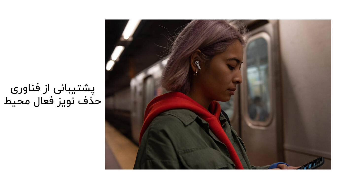 هندزفری بلوتوثی ایرپاد پرو با سیستم حذف نویز دینامیک صدای اطراف را بصورت کامل کنترل میکند. صدا مزاحم اطراف هنگام پخش موسیقی و محتوا صوتی به طور کامل ایزونه میکند. هنگام قرار داشتن ایرپاد پرو در گوش میتوانید با لمس ایرپاد این قابلیت را غیرفعال کنید و صدا اطراف را بشنوید. با این قابلیت برای شنیدن صدا اطراف نیاز به خارج کردن هندزفری از گوش نیست.