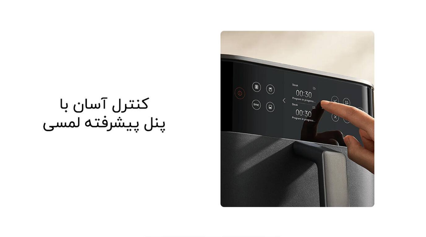 پنل کنترل شامل یک صفحهنمایش رنگی LCD بزرگ است که ۱۴ حالت پیشفرض برای غذاهای مختلف مانند سیبزمینی سرخکرده، بال مرغ، پیتزا، سبزیجات یا میوه خشک ارائه میدهدی. این نمایشگر امکان مدیریت جداگانه هر طبقه، همگامسازی و یادآوری چرخاندن غذا را فراهم میکند. محدوده دمایی ۴۰ تا ۲۳۰ درجه سانتیگراد، این دستگاه را به یک ابزار چندکاره تبدیل کرده است: سرخ کردن، خشک کردن، پخت و حتی ور آمدن خمیر. بنابراین، بیش از یک سرخکن معمولی، یک فر چندمنظوره کامپکت خواهید داشت.